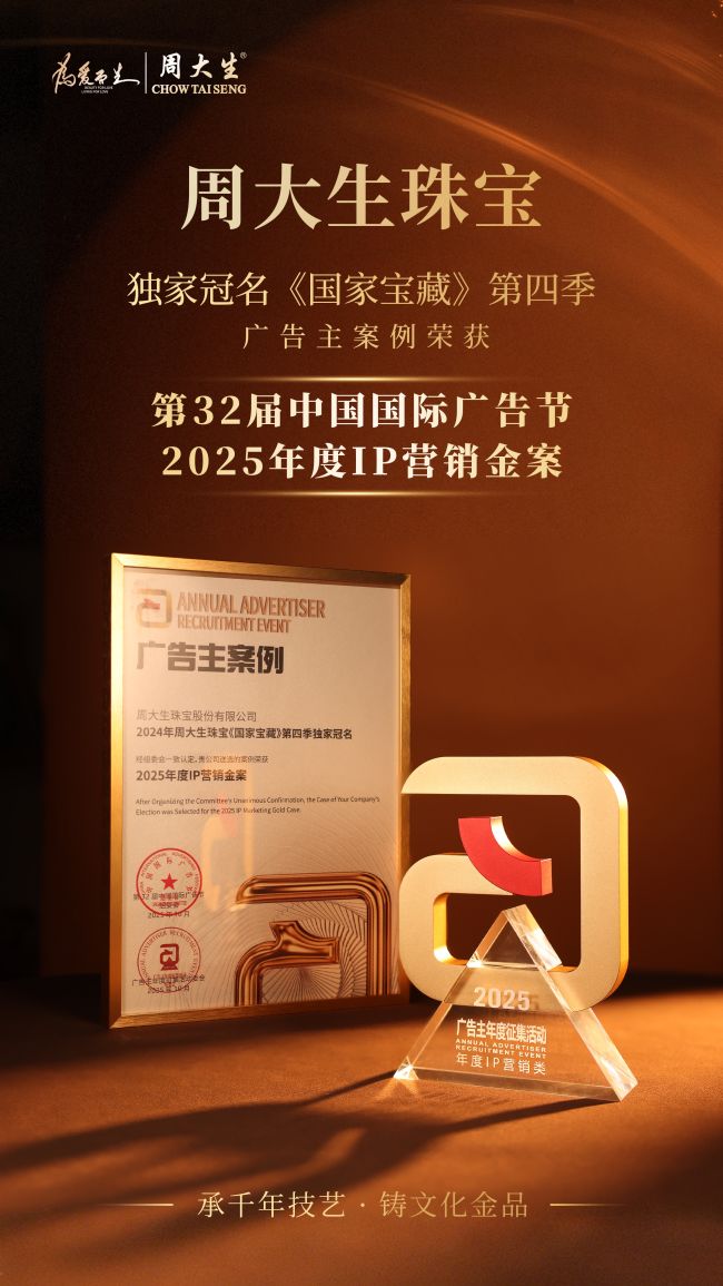 近日,在第32届中国国际广告节上,周大生珠宝凭借“2024年周大生珠宝《国家宝藏》第四季独家冠名”项目,成功斩获“2025年度IP营销金案”大奖。这一殊荣不仅是行业对周大生品牌创新营销成果的高度认可,更标志着其以文化赋能品牌、以创新驱动增长的战略实践,已成为珠宝行业融合传统文化与现代商业价值的标杆典范。