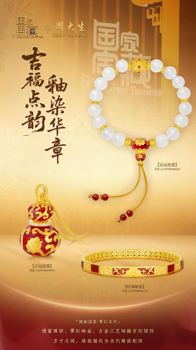 基于深厚的文化理解,周大生×国家宝藏从国宝中提炼中国代表性美学元素,创新性构建起脉络清晰、覆盖多元场景的产品矩阵:“国韵”聚焦悦己日常,将国风雅韵化为可佩戴的艺术,装点现代女性的自信风采;“家庆”致力于重要时刻的文化祝福,以蕴含国宝祥瑞寓意的金品,铭刻家庭团圆与生命礼赞的温馨记忆;“珍宝”定位为东方高级珠宝,萃取国宝至臻美学,以更奢华艺术化的设计致敬中国美学典范;“藏礼”主打高端典藏,致力于打造可传世的金艺珍品,寄托家族荣耀与文化传承。这一产品体系完整覆盖了从个人配饰、家庭赠礼到高端收藏的多维度需求,真正让国宝文化走出博物馆展柜,融入大众日常生活与情感表达。