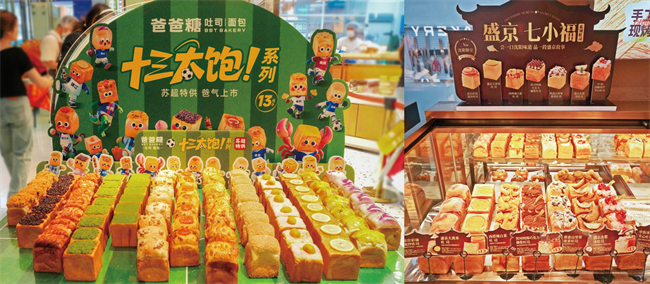 不仅如此,爸爸糖还在2025年推出了跨界赛事、文旅的地域限定新品。江苏足球联赛热梗频发时,将江苏十三城人文特色浓缩于十四款产品,上新“十三太饱”江苏城市限定吐司。国庆出游热潮时,融合沈阳文旅地标与当地人文故事,在沈阳吐司博物馆店开业时推出“盛京七小福”沈阳限定吐司。这些特色吐司,在各地及社交媒体掀起了“打卡式消费”狂潮。同年,爸爸糖还携手IP卡皮巴拉小黄豚、电影《唐探1900》《长安的荔枝》《刺杀小说家2》等联合宣发。对此业内人士评价,这标志着烘焙竞争已从口味比拼跃升至“文化场景力”的较量。
